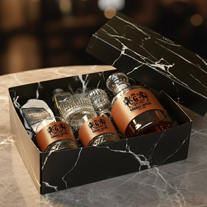1 -) Özel tasarım kutu içerisinde şık bir şekilde gönderilmektedir. Kutu 18 X 24 X 10 cm mermer desenli siyah hediye kutulu konsept hediye kutusu içerisinde;** 2 Adet Deri Kaplı Viski Bardağı. İsme özel olup, viski bardağı ölçüleri 9 cm ve çapı 7 cm'dir. Kapasitesi 800 cc hacim ölçeğine sahiptir.** Özel tasarım keten kumaş içerisinde 4 Adet Viski Taşı** 4 Adet özel tasarım kare sütlü çikolata.** 1 Adet kişiye özel 750 ML kapasiteli deri kaplı viski şişesi ve Cam çerezlik.2 -) Viski kadehleri üzerine lazer işleme tekniği ile kazıma yapılmakta olup asla silinmez özelliktedir.3 -) Bu Ürün hafta içi saat 14.00'a kadar verilecek siparişlerde aynı gün kargoya teslim edilmektedir.Ürün Etiketleri