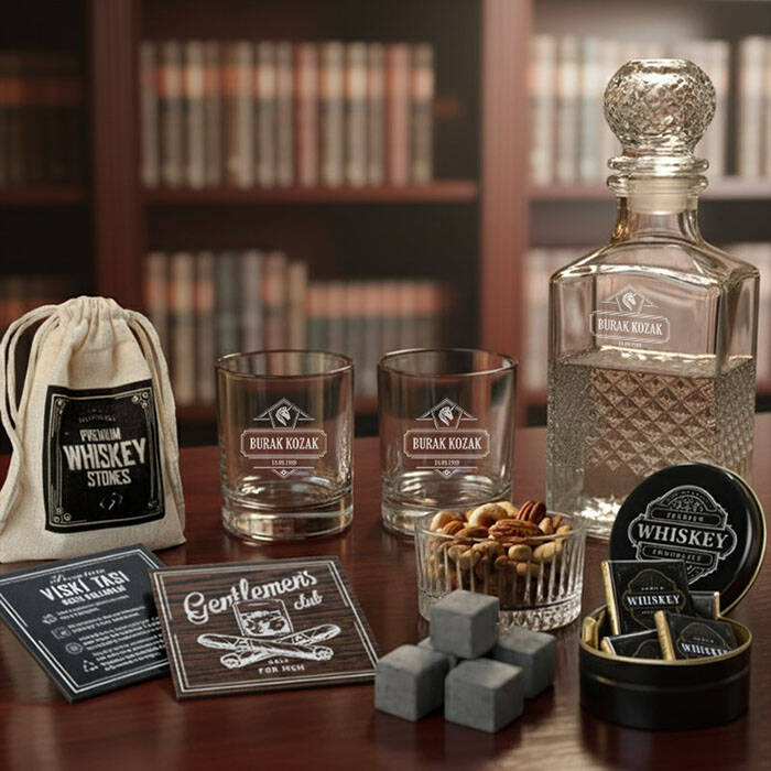 1 -) Özel tasarım kutu içerisinde şık bir şekilde gönderilmektedir. Kutu 18 X 24 X 10 cm mermer desenli siyah hediye kutulu konsept hediye kutusu içerisinde;** 2 Adet Kaliteli Viski Bardağı. İsme özel olup, viski bardağı ölçüleri 9 cm ve çapı 7 cm'dir. Kapasitesi 800 cc hacim ölçeğine sahiptir.** Özel tasarım keten kumaş içerisinde 4 Adet Viski Taşı** 4 Adet özel tasarım kare sütlü çikolata.** 1 Adet kişiye özel 750 ML kapasiteli viski şişesi ve Cam çerezlik.2 -) Viski kadehleri üzerine lazer işleme tekniği ile kazıma yapılmakta olup asla silinmez özelliktedir.3 -) Konsept Viski Hediye Kutusu hafta içi saat 14.00'a kadar verilecek siparişlerde aynı gün kargoya teslim edilmektedir.Ürün Etiketleri
