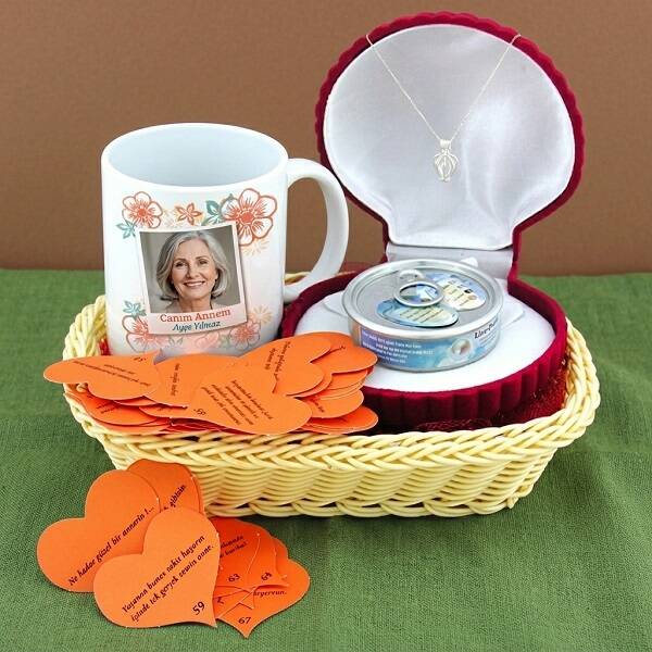 Anne sevginizi dışa vurmanın en etkili ve en kolay yoluyla sizleri buluşturmaktan mutluluk duyuyoruz. İçerisinde birbirinden kullanışlı ve şık hediyelerle hazırladığımız Kişiye Özel Güzel Annem Hediye Sepeti, sevgili annenize kendisini özel hissettirecek harikulade bir armağan! Hasır hediye sepeti içerisinde özel kadife kutusunda 925 ayar gümüş inci kolye, annelere özel fotoğraflı kupa bardak, ve 100 adet kalpli kartlarda anne sevginizi ifade edecek güzel sözler yer alıyor.