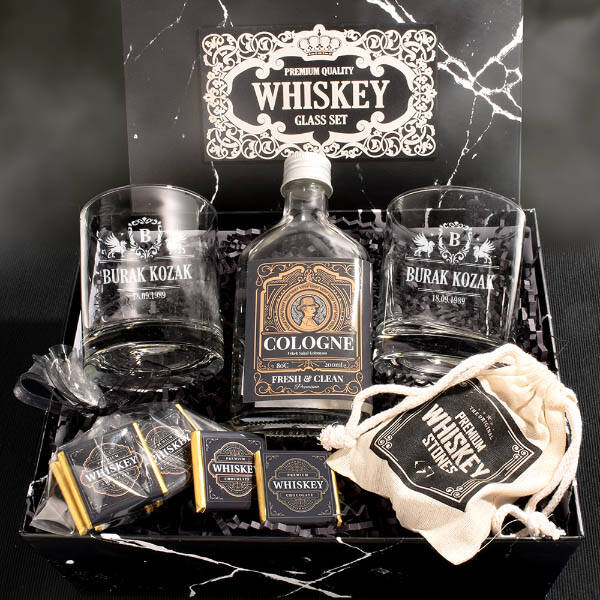 Kolonya, viski bardakları, viski taşları, çikolatalar bulunan bu harika set ile, viski içmeyi seven arkadaşınıza görsel açıdan da güzel bir armağan verebilirsiniz. Özel kutusu içerisinde bu set, viski içmeyi seven sevdikleriniz için harika bir seçim olacaktır. Lazer işlemelerimizde herhangi bir şekilde çizilme ve eskime olma ihtimali yoktur ve herhangi bir kısıtlama olmaksızın ürün veya makinelerde yıkanması mümkündür.
