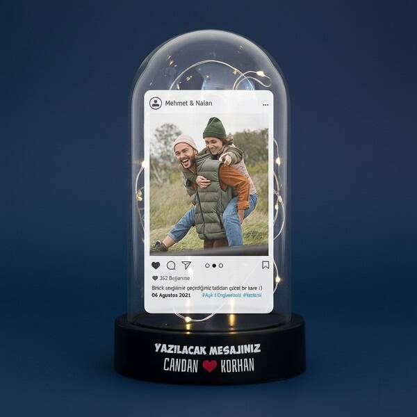 Sosyal medyanın gücünü kişiselleştirilmiş bir hediyeyle birleştirin! Bu instagram temalı fanus, sevgilinizin en sevdiği anılarından birini ölümsüzleştirmek için mükemmel bir yoldur. Peri led ışıklarıyla aydınlatılmış bu fanus, romantizmi ve nostaljiyi bir araya getirir. Ona özel bir armağan olarak bu fanusu seçerek, ilişkinizin güzelliğini ve benzersizliğini vurgularsınız.