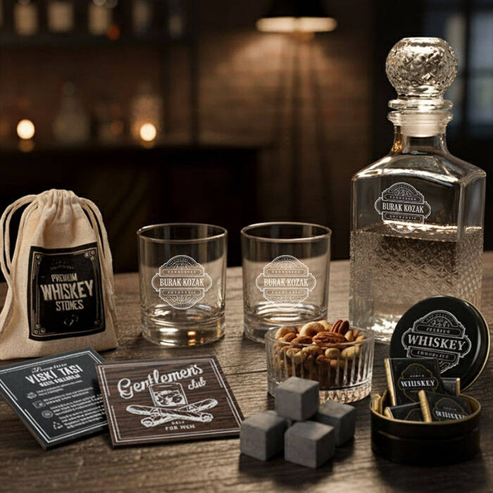 1 -) Özel tasarım kutu içerisinde şık bir şekilde gönderilmektedir. Kutu 18 X 24 X 10 cm mermer desenli siyah hediye kutulu konsept hediye kutusu içerisinde;** 2 Adet Kaliteli Viski Bardağı. İsme özel olup, viski bardağı ölçüleri 9 cm ve çapı 7 cm'dir. Kapasitesi 800 cc hacim ölçeğine sahiptir.** Özel tasarım keten kumaş içerisinde 4 Adet Viski Taşı** 4 Adet özel tasarım kare sütlü çikolata.** 1 Adet kişiye özel 750 ML kapasiteli viski şişesi ve Cam çerezlik.2 -) Viski kadehleri üzerine lazer işleme tekniği ile kazıma yapılmakta olup asla silinmez özelliktedir.3 -) Konsept Viski Hediye Kutusu hafta içi saat 14.00'a kadar verilecek siparişlerde aynı gün kargoya teslim edilmektedir.Ürün Etiketleri