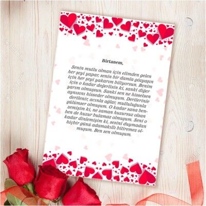 1 -) Zarf ve Mektup kağıdı A4 kağıdı boyutlarında olup ( 21 x 29,5 cm) parlak fotoğraf kağıdı kullanılarak hazırlanmaktadır.2 -) Siparişiniz halinde yukarıda yer alan kalp figürleri ile hazırlanmış aynı tasarım gönderilmektedir.3 -) Ürün görselinde yer alan kırmızı gül dekoratif amaçlı kullanılmıştır.4 -) Sevgiliye Aşk Mektubunu size özel hale getirebilmemiz için sepete ekle butonu üzerinde yer alan ürün özelleştirme alanlarını doldurmanız ve zarf üzerine yazılacak isimler belirtmeniz gerekmektedir.5 -) Sevgiliye Aşk Mektubu, hafta içi saat 14:00'a kadar verilecek siparişlerde aynı gün kargoya teslim edilmektedir.Ürün Etiketleri