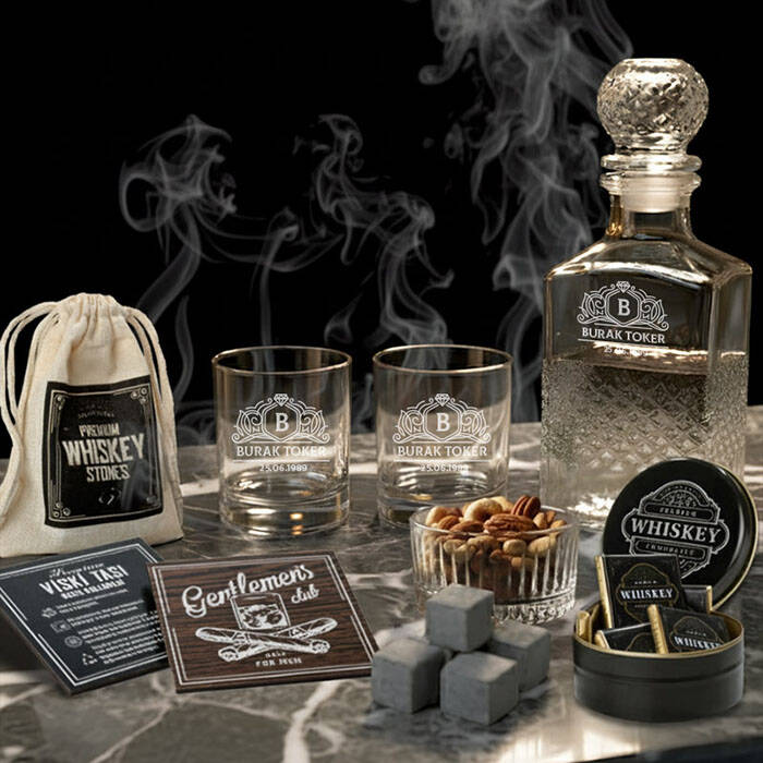 1 -) Özel tasarım kutu içerisinde şık bir şekilde gönderilmektedir. Kutu 18 X 24 X 10 cm mermer desenli siyah hediye kutulu konsept hediye kutusu içerisinde;** 2 Adet Kaliteli Viski Bardağı. İsme özel olup, viski bardağı ölçüleri 9 cm ve çapı 7 cm'dir. Kapasitesi 800 cc hacim ölçeğine sahiptir.** Özel tasarım keten kumaş içerisinde 4 Adet Viski Taşı** 4 Adet özel tasarım kare sütlü çikolata.** 1 Adet kişiye özel 750 ML kapasiteli viski şişesi ve Cam çerezlik.2 -) Viski kadehleri üzerine lazer işleme tekniği ile kazıma yapılmakta olup asla silinmez özelliktedir.3 -) Konsept Viski Hediye Kutusu hafta içi saat 14.00'a kadar verilecek siparişlerde aynı gün kargoya teslim edilmektedir.Ürün Etiketleri