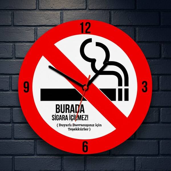 "Dumansız havası","No Smoking","Burada Sigara İçmenin Cezası..." gibi mesajlar olmasına karşın, gelin görün ki bu uyarıları pek de takan yok. Bazı sigara kullanıcılarının, hayatında ağzına hiç sigara almamış veya sigaranın dumanından ve kokusundan tiksinti duyan kişilere karşı böylesine nezaketsizlikleri bazen olabiliyor. "Küçücük bir duman solumaktan hiçbir şey olmaz" yaklaşımıdır bu. Yani bir nevi büyük bir saygısızlık! İyisi mi söz konusu salık olduğunda işi şansa bırakmamak lazım! Yani sigara içmeye heveslenen kişileri her defasında sözlü olarak uyarmak yerine, bunu yazılı olarak sürekli şekilde uyaracak özel bir şey olabilir. İşte karşınızda dilediğiniz mesajınızla hazırlatabileceğiniz Kişiye Özel Sigara İçilmez Duvar Saati.