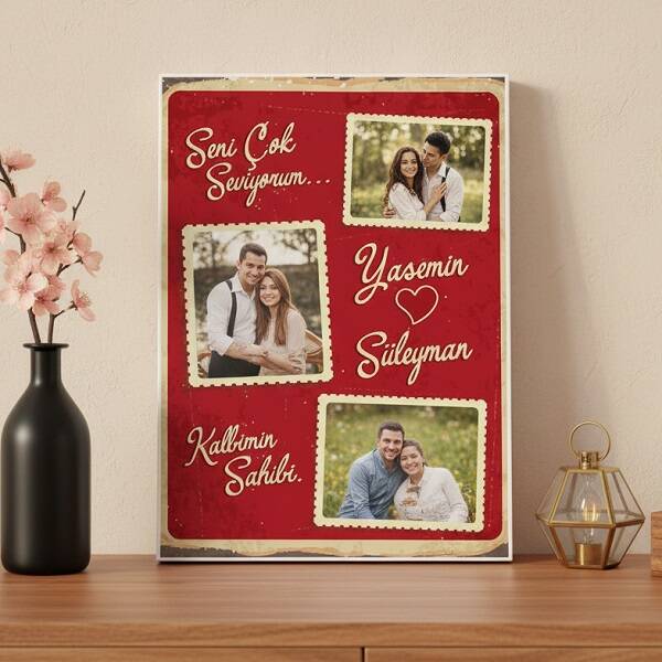 Tekrar tekrar yaşamak istediğiniz o güzel aşk günlerinize, nostaljik bir yolculuğa çıkmaya hazır mısınız? Sevgilinizle yaşanmışlıklarınızı en iyi yansıtan 3 özel fotoğrafınız ve kişisel mesajlarınızla, size özel bir kanvas tablo hazırlıyoruz! Kişiye Özel Vintage Kanvas Tablo üzerinde aşkınız için efsane olmuş en güzel 3 fotoğrafınızı, isimlerinizi ve romantik aşk mesajlarınızı taşıyarak sevgilinize acayip güzel bir sürpriz yapabilirsiniz. Tasarımında aşk kırmızısı ve retro fitoğraf çerçevesi figürleri kullandığımız Vintage Kanvas Tablo, sadece Hediyemen.com'da.