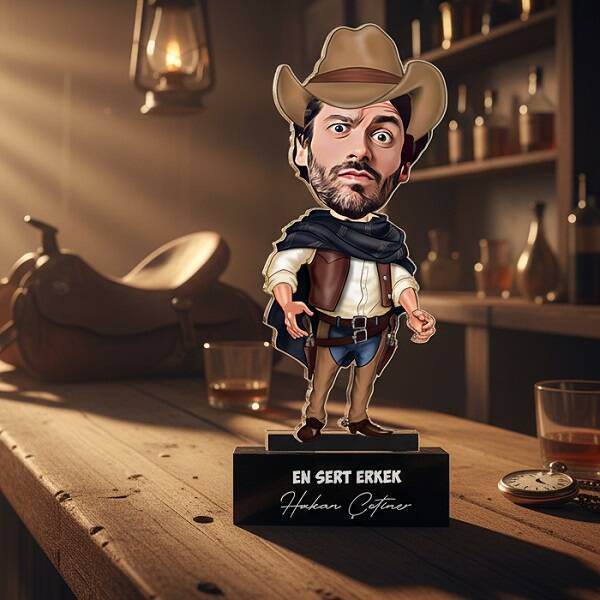 Çizmesi, kovboy şapkası, tabancası, deri yeleği, kot pantolunu ve şapkası! Sevdiğinizi Western filmlerindeki kovboylar gibi karikatürize edeceğimiz bu şirin biblo ile Ona hayatının en orijinal hediyesini sunabilirsiniz. Klişe yılbaşı hediyelerinden koparak sevdiğiniz adama kendisine özel olacak bu karikatürlü bibloyu şimdi bizim farkımızla hazırlatabilirsiniz.