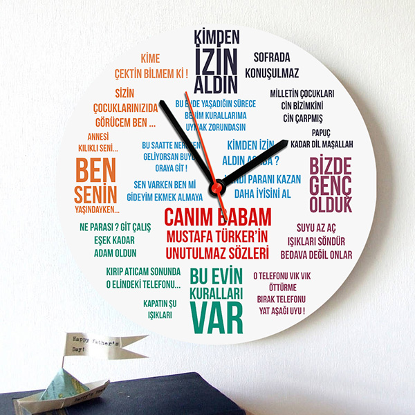 Her baba evladının iyiliğini ister. Dolayısıyla da kanından canından çocuğunun mutluluğu için her türlü fedakarlığı yapmaya da hazırdır. Ancak kendisine sevgiyle "BABA" desek de her babanın karakteri farklılık göstermektedir. Kimi baba aşırı derecede sert bir mizaç sergiler, kimi baba yüksek derecede çocuklarına karşı koruyucu ve kollayıcı davranır, kimi baba ise oldukça duygusal bir yapıya sahiptir. Ancak takdir-i ilahi midir bilinmez her babanın öfkelendiğinde, kızdığında veya sitem ettiğinde evladına söylediği sözler birbirine benzer özellikler göstermektedir. Misal; "Kimden İzin Aldın?","Biz de senin gibi gençtik." ,"Sen varken ben mi gideyim ekmek almaya?","Kırıp Atıcam bak, elindeki şu telefonu!","Milletin Çocukları Cin! Bizimkini ise Cin Çarpmış...","Suyu az aç, Boş yere ışıkları açık bırakma! Bedava değil onlar..." gibi sözleri babalarımızdan hepimiz çok işitmişizdir.İşte babalarımızdan duymaya alışkın olduğumuz klasik sözler, babalarımız için şahane bir hediye seçeneği Klasik Baba Sözleri Duvar Saati üzerinde kendisine yeniden yer buldu. Sevgili babanızın ismine ve Ona söylemek istediğiniz mesajınıza özel olarak hazırlanacak Klasik Baba Sözleri Duvar Saatiyle, babanıza hem harika bir sürpriz yapacak, hem de en unutulmayacak hediyelerden birini vermiş olacaksınız!