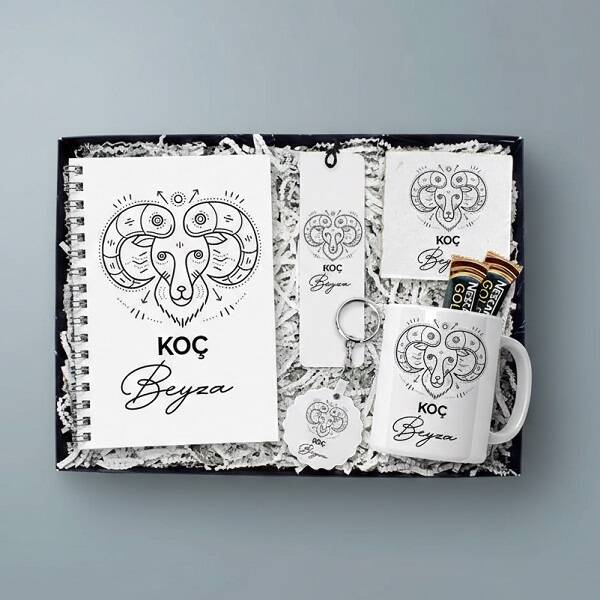 1 -) Hediye kutusu içerisinde 7 parça ürün yer almaktadır.** 1 Adet Koç burcu tasarımlı çizgisiz defter** 1 Adet Koç burcuna özel tasarımlı isme özel kitap okuma ayracı.** 1 Adet Koç burcuna göre hazırlanmış isme özel kupa bardak ve 2 adet Nescafe Gold 3'ü 1 arada kahve** 1 Adet Koç burcu tasarımlı taş bardak altlığı** 1 Adet Koç burcu tasarımlı papatya şeklinde anahtarlık2 -) Kutu Ölçüleri: 19,5 X 14,5 cm.'dir. Harika bir sunuma sahip olan bu özel hediye kutusuyla Arkadaşınıza Etkileyici bir Doğum Günü sürprizi yapabilirsiniz.3 -) Koç burcuna hediye Konsept Kutu üzeri kurdela ile bağlanmış şık bir şekilde şeffaf kutu içerisinde zarif bir görünüme sahiptir.Ürün Etiketleri