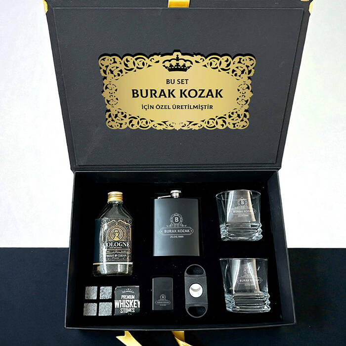 1 -) Siyah renkte fantezi kutu içerisinde gönderilmektedir. Kutu ölçüleri: 36 X 26 X 13 cm.2 -) Set içerisinde yer alan 2 Adet viski bardağı üzerine isim lazer ile kalıcı şekilde işlenmektedir. 8,5 cm X 9,5 cm genişliğindedir. Hacim 210 cc.3 -) Set içerisinde 2 adet Viski Bardağı + Kesede 4 Adet Viski Taşı + 1 Adet Metal Çakmak + 1 Adet Puro Makası + 1 Adet İçki matarası + 1 Adet Kolonya almaktadır.4 -) Viski tüketen sevdiklerinize harika bir hediye seçeneğidir.5 -) Bu premium set hafta içi saat 14.00'a kadar verilecek siparişler için aynı gün kargoya teslim edilmektedir.Ürün Etiketleri