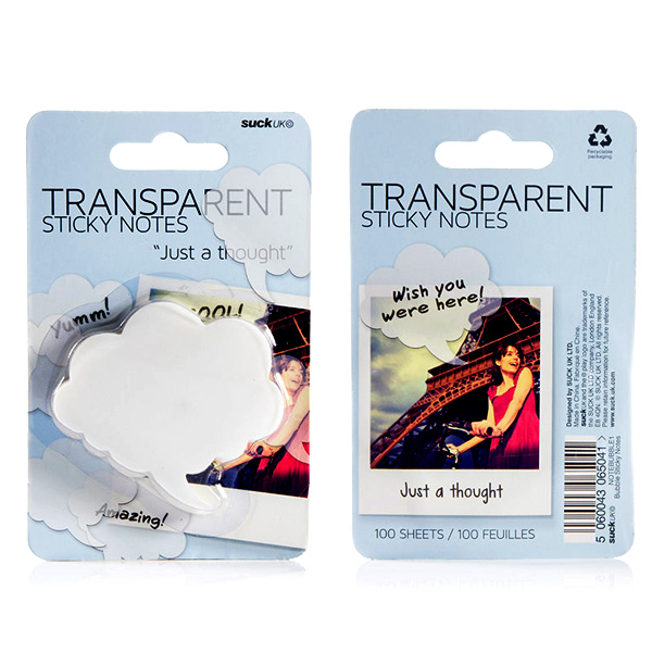 Bazı yapılacak işleri gün içerisinde sürekli unutuyorsanız ya da sevgilinize sık sık romantik sürprizler yapıyorsanız , hatırlatıcı mesajlarınız için konuşma balonu şeklindeki transparan not kağıtları tam da size göre. Standart not kağıtlarının aksine şeffaf ( trasnparan ) özelliğe sahip konuşma balonu görünümlü not kağıtları , yapıştırdığınız yüzeyin altındaki görseli %50 oranında göstermektedir. Sevgilinizin odasını güzel mesajlar ile donatmak isteyen romantik aşıklar için mutlaka temin edilmesi gereken bir ürün.