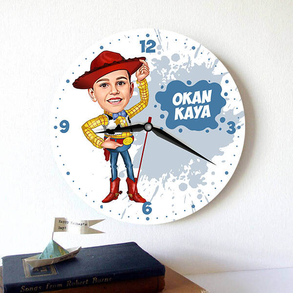 Eğer sizde çocuğunuzun odasının duvarında sevimli bir dekoratif obje arıyorsanız, alınabilecek en güzel hediye tabiki karikatürlü bir duvar saatidir. Çocuğunuzun fotoğrafından oluşturduğumuz bu kovboy temalı duvar saati, çocuğunuzun odasının duvarına oldukça hava katacak cinste. Sizinde çocuğunuzun doğum günü yaklaşıyor ya da bir yakınınızın alınabilecek en güzel hediye tercihlerinden olabilir.