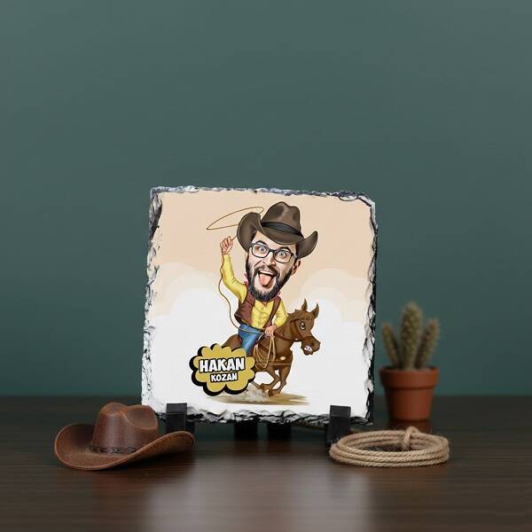 Western filmleri erkeklerin severek ve merakla izledikleri, aynı zamanda erkekliğin de tavan yaptığı en dikkat çekici filmler oluyor. Vahşi Batı'da yaşamak birçok erkeğin en büyük hayali de olabilir. At üstünde yakışıklı bir kovboy kompozisyonu ile hazırladığımız bu taş baskı, sevdiğiniz erkeğin karikatürüne özel olarak hazırlanıyor. Siz de kovboyları merakla takip eden sevdiğinize böyle esprili bir hediye ile güzel bir doğum günü jesti yapabilirsiniz.