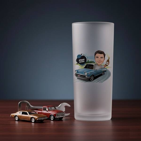 Mavi Klasik Araba ve Ben Karikatürlü Rakı Bardağı