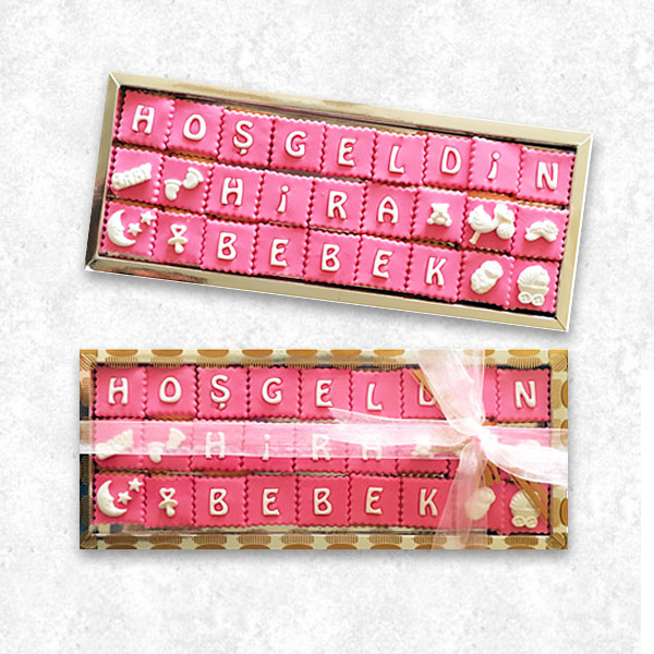 Dilediğiniz mesaja ve bebek ismine özel olarak hazırlatabileceğiniz bebek kurabiyeleri şık sunumu ve inanılmaz güzel lezzetleri ile Hediyemen.com sayfalarında. Doğum sonrası anne olan yakın arkadaşınıza bizimle beraber tatlı bir sürpriz yapmaya var mısınız? Kız bebeklere özel olarak pembe renk tonlarında hazırlanmış olan ve kaliteli tere yağı kullanılarak lezzette Nirvana'ya ulaşmış olan Kız Bebeklere özel pembe kurabiyeleri, çiçeği burnunda anne olan arkadaşınıza sunabileceğiniz en yaratıcı armağanlardan bir tanesi. Üzeri kurdele ile sarılı şık kutusu, dilediğiniz mesajınızı üzerine taşıyabiliyor olmanız ve harika lezzetleri ile güzel bir hatıra hediyesi olacak olan Mesajlı Kız Bebek Butik Kurabiyelerini Türkiye'nin her yerine güvenle sipariş verebilirsiniz.27 harf veya sayı ile dilediğiniz mesajınızı kurgulayın size özel butik kurabiyeler tasarlayalım! Kız bebekler için özel olarak hazırladığımız ve günlük olarak üretimi yapılan taptaze butik kurabiyeler ile siz de doğum yapan sevdiklerinize en akılda kalıcı hediyeyi verebilirsiniz.
