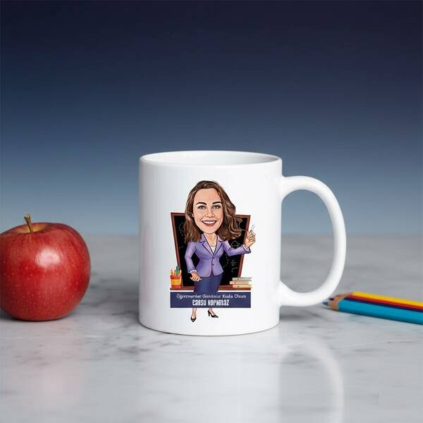 Mor elbiseli kadın öğretmen için özel olarak hazırlanan bu karikatürlü bardak, renkli ve eğlenceli tasarımıyla öğretmenin günlük kahve veya çay ritüelini renklendiriyor. Mor elbisesiyle ünlü bu öğretmen için, sıradan bir bardak yerine özel tasarlanmış bu hediye, ona duyulan sevgiyi yansıtıyor.