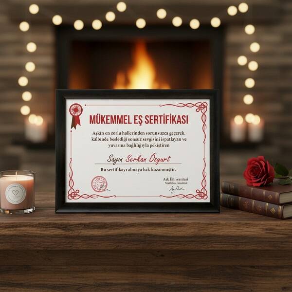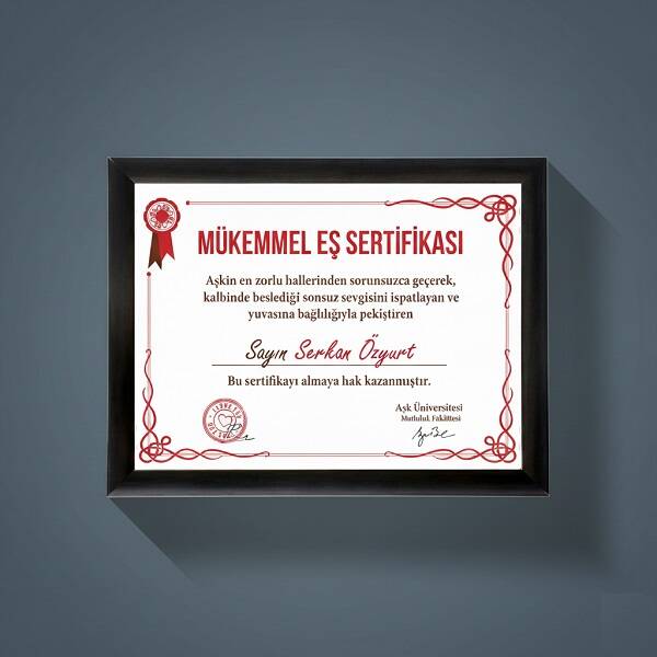 Eşinize hediye edeceğiniz sertifikanın başlığını ister "Mükemmel Eş Sertifikası" olarak değiştirmeden aynı bırakın, İsterseniz de "Yılın En İyi Eşi Sertifikası" başlığı altında düzenleyin. Eşinize evlilik yıl dönümünde, sevgililer gününde sürpriz yapmak istiyorsanız, Mükemmel Eş Sertifikasından daha anlamlı ve romantik bir hediye biz düşünemiyoruz. Hem masada, hem de duvarlarda sergilenebilen Mükemmel Eş Sertifikası yıllarca eşinizi her baktığında mutlu kılacak en özel armağanlardan biri.Mükemmel Eş Sertifikası Hakkında Bilinmesi Gerekenler