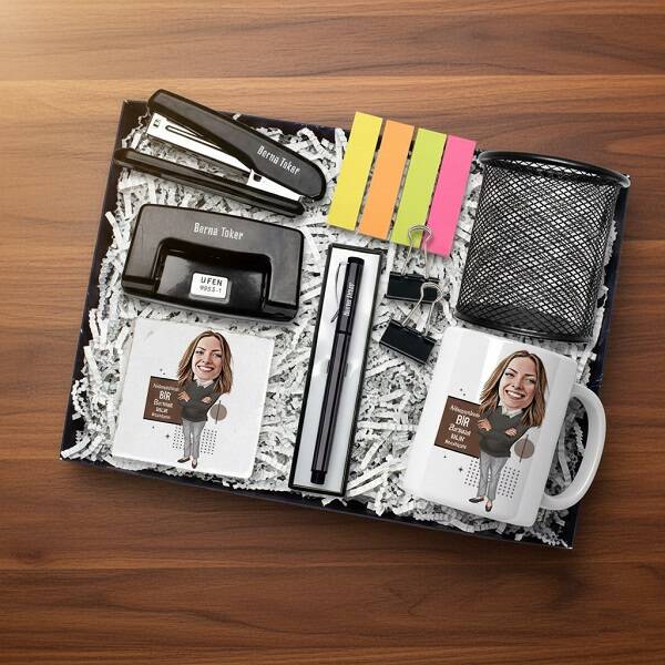 Özellikle de son zamanların popüler ürünlerinden olan karikatürlü hediye fırsatı kaçmaz. Sevgilinize özel olarak tasarlanacak bu hediye kutusunun hissettirecekleri paha biçilmez olacaktır. Özellikle bu hediye kutusundaki kupa ve bardak altlığında karikatürünün yer alıyor olması bu prestijli ofis konsept hediye kutusunu tamamen sevgilinize özel kılıyor olacak.Kişiye özel ofis ürünlerimiz ile ofisler adeta sevgiyle donatıyoruz. Mesajlı, isimli, fotoğraflı, dekoratif aklınıza gelebilecek her türlü hediye alternatifi bu sayfalarda sizleri bekliyor. İddia ediyoruz ki nihayetinde bir güzel kolay yetişmiyor ofis hediyesi, prestijli bir ofis & büro armağanı olarak biricik sevgilinizin çok hoşuna gidecektir. İş hayatındaki tüm sevdiklerinizi kutlamak, başarı dilemek ve kendilerine bol şans iletmek için en güzel ofis hediyelerini hediyemen üzerinden kendilerine yollayabilirsiniz.Sevgilinizin ofis adresine resmini gördüğünüz ve kendisine özel karikatür çalışmasının yer alacağı kahve kupasının ve taş bardak altlığının olacağı bu şık konsept hediye kutusunu göndermeye ne dersiniz? İçerisinde sevgilinizin keyif alarak kullanacağı müthiş ofis ürünleri yer alan bu özel hediye kutusu, sizden kendisine en esprili ofis hediyelerinden biri olacak. Karikatürlü kupa bardak ve bardak altlığı ile sevgilinizi kahkahaya boğacak; diğer yandan zımba makinesi, delgeç, post - it yapışkanlı not kağıtları, kalemlik, isme özel kalem ile de sevgilinizin her zaman ofiste ihtiyaç duyduğu kırtasiye ürünlerine de bu setle mükemmel bir cevap vermiş olacaksınız.