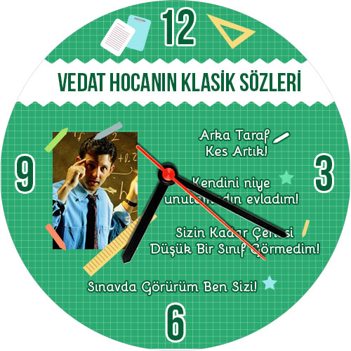 Sevgili Öğretmeninizin artık herkesçe bilinen ve tüm sınıfınızın ezberlediği o klasik sözlerini, şık bir duvar saati üzerinde ölümsüzleştirmeye ne dersiniz? Hem öğretmeninizin fotoğrafına, hem de klasik sözlerine özel olarak hazırlanacak bu duvar saati ile Biricik Öğretmeninize 24 Kasım Öğretmenler Günü için en esprili ve güzel hediyelerden birini verebilirsiniz.