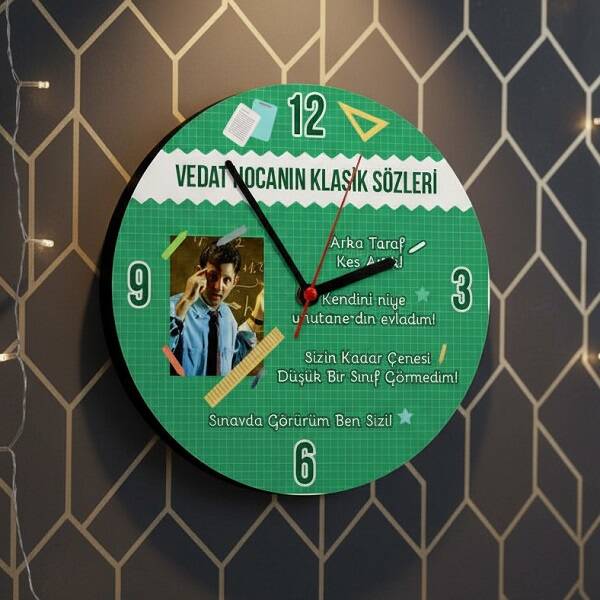 Branşları farklı olsa da tüm öğretmenlerin adeta söz birliği etmişlercesine ortak kullandıkları bazı sözler vardır; Mesela bunlardan bir kaçı; Öğretmen Tahtada sınıfa sırtı dönük ders anlatırken kopan gürültü üzerine "Arka Taraf Kesin Sesinizi..." demesi gibi. Mesela; sabah sınıfa geç gelen öğrenciye "Oğlum! Kendini niye unutmadın?" demesi. Son bir örnek daha; Yaramazlık yapan sınıfa konuşma yaparken "Sınavda görürüm ben sizi" şeklindeki serzenişleri gibi. Öğretmenimin Klasik Sözleri Fotoğraflı Duvar Saati işte bu anlardan ilham alınarak tasarlanmıi son derece esprili bir öğretmenler günü hediyesi.