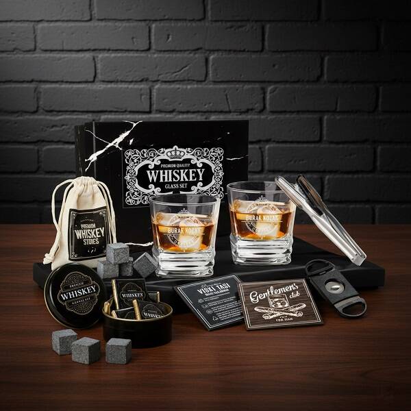 1 -) 18 X 24 X 10 cm mermer desenli siyah hediye kutulu konsept hediye kutusu içerisinde;** 2 Adet Kaliteli Elegan Viski Bardağı. İsme özel olup, viski bardağı ölçüleri 9 cm ve çapı 7 cm'dir. Kapasitesi 800 cc hacim ölçeğine sahiptir.** 4 Adet Viski Taşı** 4 Adet özel tasarım kare sütlü çikolata. Metal şık hediye kutusu içerisinde sunulur.** 2 adet özel tasarımlı ahşap bardak altlığı.** 1 adet puro giyotini( makası)** 1 adet buz maşası2 -) Özel tasarım kutu içerisinde şık bir şekilde gönderilmektedir.3 -) Viski kadehleri üzerine lazer işleme tekniği ile kazıma yapılmakta olup asla silinmez özelliktedir.4 -) Orijinal Viski Hediye Seti hafta içi saat 14.00'a kadar verilecek siparişlerde aynı gün kargoya teslim edilmektedir.
