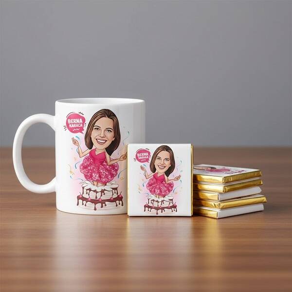 Pastadan Çıkan Kadın Karikatürlü Kupa ve Çikolata
