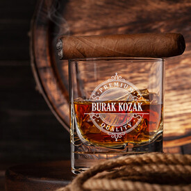Kişiye özel deri kaplı viski şişesi, içerisindeki zengin içecek kadar dikkat çekici bir tasarıma sahip. Bu muhteşem şişe, 8 cm x 22 cm x 12 cm ölçülerinde ve 750 ml hacimlidir. Tıpası yüksek kaliteli kristal camdan yapılmıştır ve şık bir şekilde üretilmiştir. Şişenin dışı, el yapımı kaliteli deri ile kaplanmıştır. Üzerine silinmez özellikte lazer ile isim işlemesi ve tasarım süslemesi yapılmaktadır. Ayrıca, kristal cam süslemeleriyle de dikkat çeker.