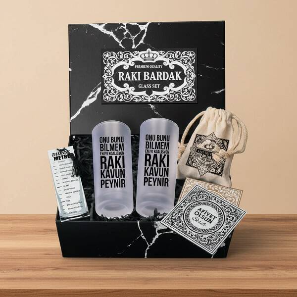 1 -) 18 X 24 X 10 cm mermer desenli siyah hediye kutulu konsept hediye kutusu içerisinde;** 2 Adet Kaliteli Rakı Bardağı.** 4 Adet Alkol Soğutma Taşı** 2 Adet Özel tasarım "Afiyet Olsun" ve "Şerefe" mesajlı ahşap bardak altlığı.** 1 Adet esprili bir dille hazırlanmış Duble Metre.2 -) Özel tasarım siyah hediye kutusunda şık bir şekilde gönderilmektedir.3 -) Rakı kadehleri üzerine silinmeyecek baskı tekniği ile kişiselleştirme yapılmaktadır.4 -) Rakı Koalisyonu Hediyelik Rakı Kadehi Seti Hediye Kutusu hafta içi saat 14.00'a kadar verilecek siparişlerde aynı gün kargoya teslim edilmektedir.Ürün Etiketleri