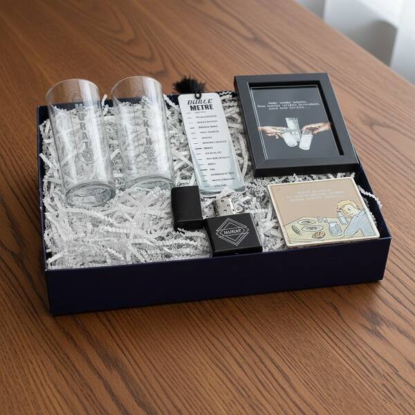 Bardakta durduğu gibi durmuyor bu melet. Rakı içmenin de bir usulü, bir erkanı vardır. Rakı masasındaki er kişi de kendini ve sınırını bilmelidir tabi ki! Rakı Severlere Özel Konsept Hediye Kutusu, rakı içme kültürünü bilen ve keyifli kaçamaklar yapan erkekler için hazırlanmış konbin bir hediye kutusudur. İçerisinde isme özel 2 adet rakı kadehi, isme özel benzinli çakmak, 2 adet rakı ile ilgili enfes sözlerden hazırlanmış taş bardak altlığı, yine rakı ile ilgili sözlerden hazırlanmış resim çerçevesi ve Duble Metre bulunan bu keyifli kutuyu rakı severlere çekinmeden hediye edebilirsiniz.