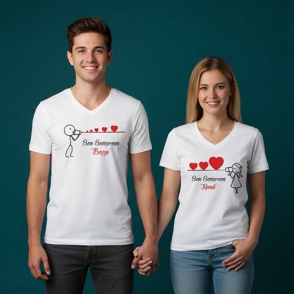 4 -) Sevgili Tişörtleri beyaz renkte olup, erkek ve bayan için "V" yaka modeli bulunmaktadır.