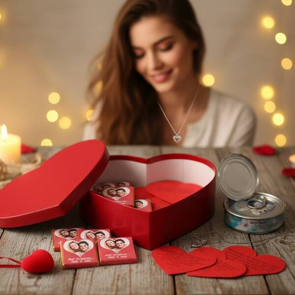 1 -) Kırmızı Kalp Kutu içerisinde 10 adet fotoğraf baskılı sütlü kare çikolata.** Çikolataları kendinize özel hale getirmek için siparişiniz esnasında 1 adet fotoğraf yüklemeniz, isimlerinizi ve mesajınızı belirtmeniz gerekmektedir.2 -) 100 Adet Seni Sevme Nedenlerim Kartları.** Kalp şeklindeki kartlar üzerinde "Seni Seviyorum Çünkü, yaşama tutunma nedenim yalnızca sensin." tarzında farklı 100 adet romantik mesaj yazılı...3 -) İstiridye içerisinde Gerçek İnci Kolye.** Özel muhafazalı konserve kutusu içerisinde deniz suyu ile muhafaza edilen göz kamaştırıcı ve parıltılı gerçek bir inci tanesi. Kız arkadaşınızın inci tanesi ile hazırlanmış kolyeye bayılacağını düşünüyoruz.4 -) Ayrıca kutu içerisinde bu 3 özel ürüne ek olarak kırmızı kalp süsler bulunmaktadır.5 -) Finalde ise, kalp şeklindeki hediye kutusu kırmızı tüle sarılarak, üzeri beyaz renk kurdele ile sarılmakta ve oldukça şık bir şekilde sunulmaktadır.** "Seni Seviyorum Çünkü Bir Sürü Nedenim Var" Hediye Sepeti ile sevgilinizin aklını başından alacak, O'nu mutluluktan bulutların üzerine taşıyacaksınız.Ürün Etiketleri