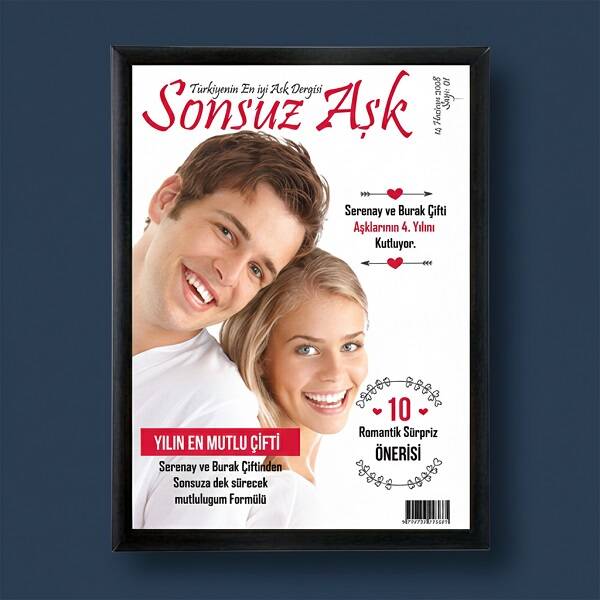 "Ama hep de böyle de olmaz ki! Her zaman ünlüler mi dergi kapaklarını süsleyecek? Bizim aşkımız da dergi kapaklarına taşınsın istiyorum" diye düşünüyorsanız, işte yalnızca size ve aşkınıza özel olarak hazırlanacak dergi kapağı karşınızda! Şık siyah çerçeveye sahip, masa üzerinde veya duvarda sergilenebilen Sevgililere Özel Dergi Kapağı ile sonsuz aşkınızı dergi manşetlerine taşıyın.