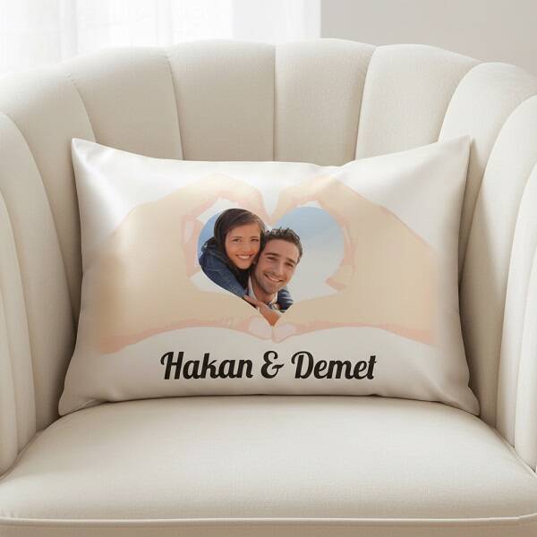 Durun! Mükemmel bir poz yakaladık sakın bozmayın... Aşkınıza dair en güzel fotoğrafınızla hazırlayacağımız Sevgililere Özel El İçinde Kalp Fotoğraflı Yastık, isimlerinize özel olarak hazırlanıyor. Size ise sadece bu romantik yastığı sevgilinize hediye etmek kalıyor.