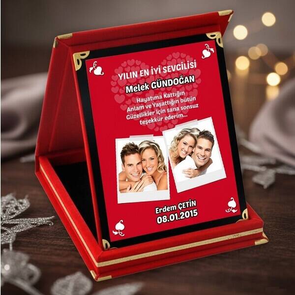Biricik sevgilinize hayatınıza kattığı tüm güzellikler için anlamlı bir teşekkür etmek isterseniz, Sevgililere Özel Fotoğraf ve Mesajlı Plaket tam size göre. Aşkın en ateşli rengi olan kırmızı renge sahip kadife kaplı dış kapağı ile son derece şık bir görünüme sahip olan Sevgililere Özel Plaket, 2 adet fotoğrafınıza, kişisel mesajınıza, size özel bir tarihe ve isimlerinize özel olarak hazırlanıyor.