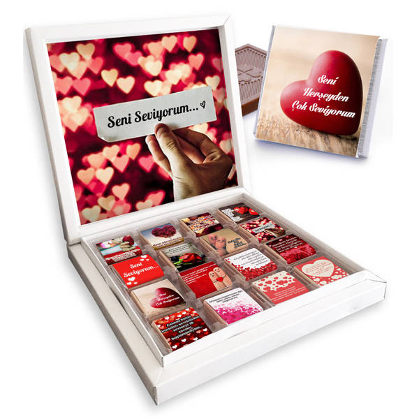 Üzerinde acayip derecede romantik mesajlar ve resimlerin yer aldığı; aynı zamanda her biri özel tasarlanmış olan tam 16 adet çikolata ile sevgilinizi mutlu etmeye var mısınız? Şık hediye kutusuyla adresinize göndereceğimiz Sevgilime Seni Çok Seviyorum Çikolatası tüm özel günlerin en iddialı hediyesi! Ayrıca arada aramızda kalsın; bu özel çikolatayı sadece Hediyemen.com'da bulabilirsiniz.