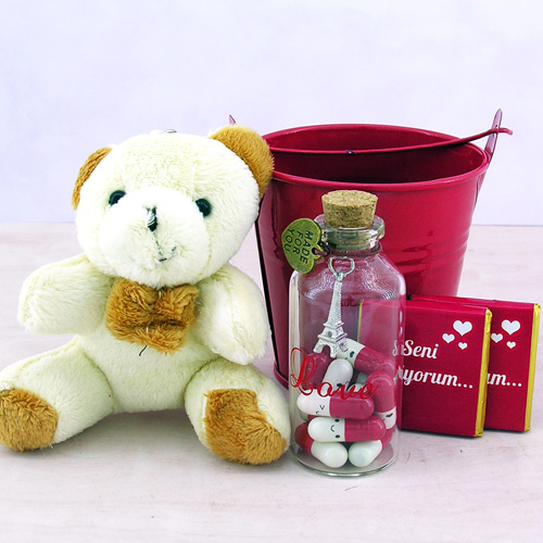 1 -) Kova içerisinde 3 parça hediyelik bulunmaktadır. 2 adet seni seviyorum yazılı çikolata, 1 adet mini mesaj şişesi, 1 adet peluş oyuncak anahtarlık.