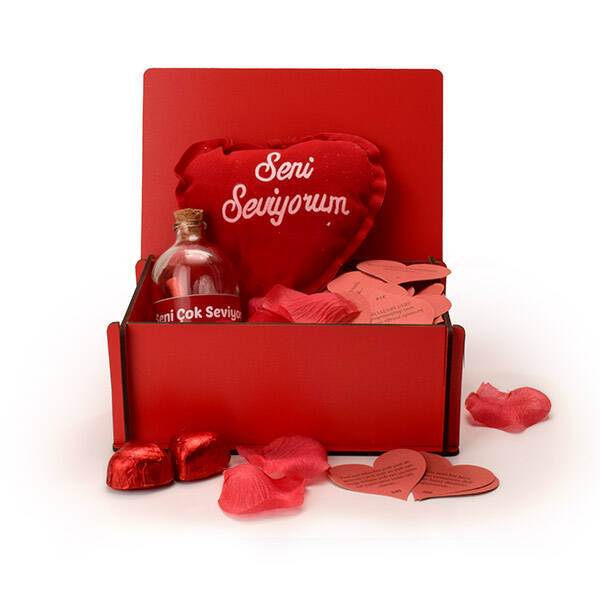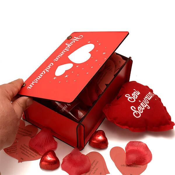 Kırmızı renk kalp kutu içerisinde yer alan 365 adet "Seni Seviyorum Çünkü Bir Sürü Nedenim Var" kalpli mesaj kartları ile sevgilinizin kalbine yağmur gibi mutluluk yağdıracaksınız. Sepet içerisinde ayrıca sevgilinize özel hazırlayacağınız güzel sürpriz bekliyor. Ağzı deniz yıldızı mantar tıpa ile kapalı minik mesaj şişesi! Şişe içerisinde yer alan rulo şeklindeki kırmızı mesaj kağıda kendi el yazınızla, ister sevgililer gününü kutlayan mesajınızı yazın, ister doğum günü için anlamlı bir notunuzu, isterseniz de şişe içerisine yüzük koyarak romantik bir biçimde evlilik teklifinde bulunun! Sevgilinize duyduğunuz hayranlığı, aşkı ve özleminizi en romantik şekilde gösterebileceğiniz Sevgiliye Özel Hayatımın Anlamısın Hediye Sepeti, tüm özel günler için en romantik hediye alternatifi.Sevgiliye Özel Hayatımın Anlamısın Hediye Sepeti Hakkında Bilinmesi Gerekenler