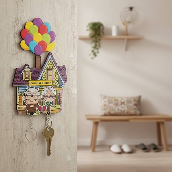 Günlük hayatın koşturmacasında, küçük detaylar bize aslında neyin önemli olduğunu hatırlatır. Bu sevimli anahtarlık askısı, sadece anahtarlarınızı düzenlemekle kalmaz; aynı zamanda sizi ve sevdiklerinizi her gün mutlu edecek minik bir anı olarak evinizin bir parçası olur. Kişiye özel isimlerle hazırlanan bu anahtarlık askısı, duvarınıza estetik bir dokunuş katarken, her bakışta sizi çocukluk hayallerinizin neşesine geri götürür. Balonlarla uçan evin renkli ve eğlenceli tasarımı, her gün bir parça mutluluk sunar. sevgiliye hediye bayan için düşünülebilecek en yaratıcı ev armağanlarından biri.