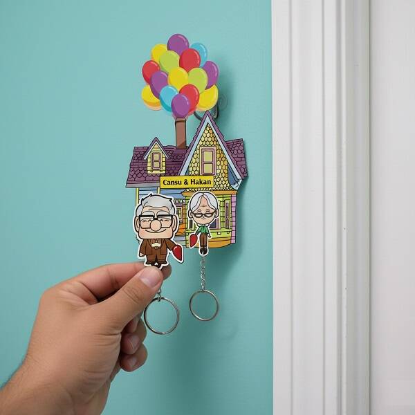Balonlarla gökyüzüne doğru yükselen bu tatlı ev tasarımı, MDF üzerine canlı süblimasyon baskıyla hayat buluyor ve adeta hayal dünyanızın kapılarını aralıyor. Hem anahtarlık askısı hem de kişiye özel anahtarlık olarak tasarlanan bu eşsiz ürün, her eve döndüğünüzde sizi karşılayan bir mutluluk kaynağı olacak. Eşiniz ya da sevgilinizle paylaştığınız anılarınızı yansıtan bu sevimli figürler, sıradan bir anahtarlık askısından çok daha fazlasını sunuyor.