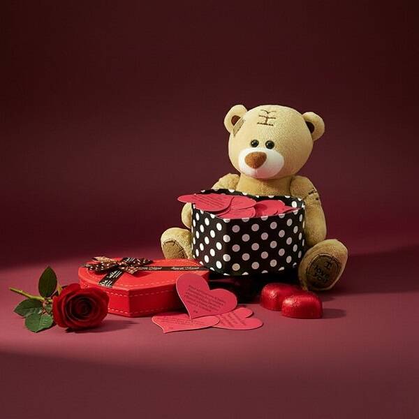 2 -) Peluş oyuncak ayıcığın kucağında tuttuğu kalp kutu içerisinde, kalpli kartlarda yazılı 100 adet birbirinden farklı Seni Seviyorum çünkü bir sürü nedenim var sözleri ve 2 adet de kalp çikolata bulunmaktadır.