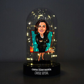 Siyah kıyafetli kadın öğretmeni temsil eden bu karikatürlü fanus biblo, öğretmenler günü veya özel bir gün için şık bir hediye seçeneği sunuyor. İşıklı fanus içinde yer alan bu özel biblo, siyah kıyafeti ve öğretmenlik mesleğini mükemmel bir dengeyle yansıtarak, öğretmeninizin özel gününü aydınlatıyor.