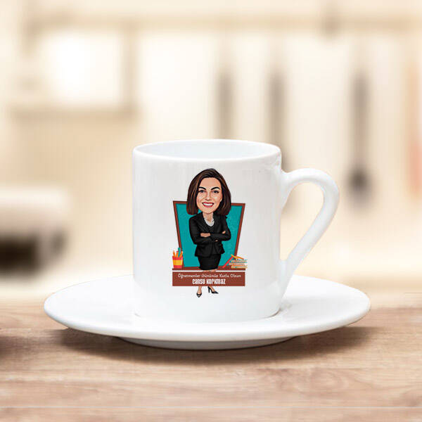 Siyah Kıyafetli Kadın Öğretmen Karikatürlü Kahve Fincanı
