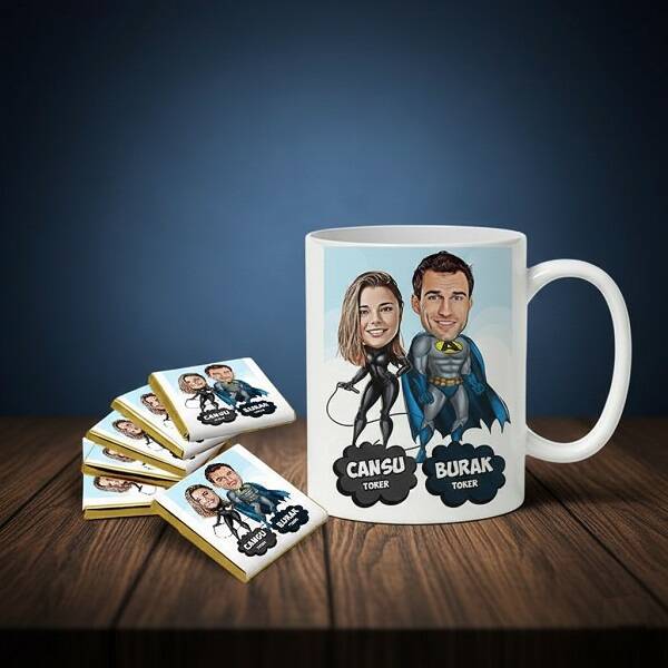 Süper Kahraman Çiftler Karikatürlü Kupa ve Çikolata