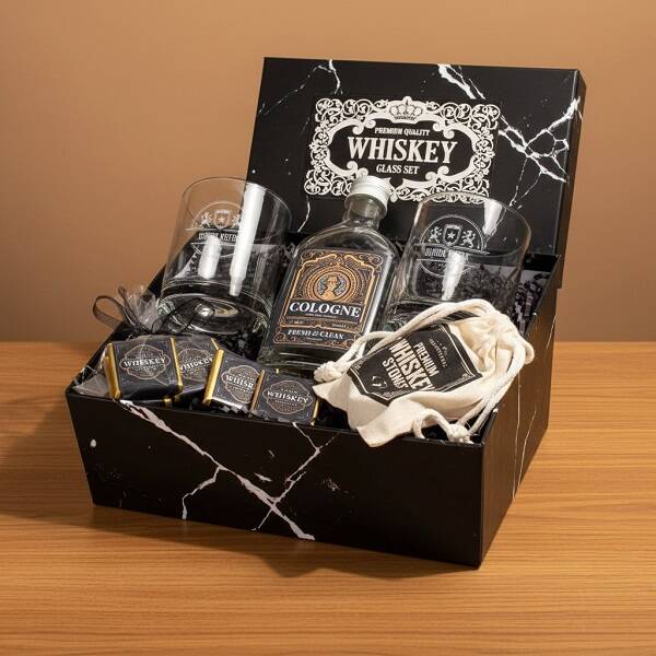 1 -) 18 X 24 X 10 cm mermer desenli siyah hediye kutulu konsept hediye kutusu içerisinde;** 2 Adet Kaliteli Viski Bardağı. İsme özel olup, viski bardağı ölçüleri 9 cm ve çapı 7 cm'dir. Kapasitesi 800 cc hacim ölçeğine sahiptir.** 4 Adet Viski Taşı** 6 Adet özel tasarım kare sütlü çikolata.** 1 Adet Okyanus Esintisi Fresh kolonya. 80 derece.2 -) Özel tasarım kutu içerisinde şık bir şekilde gönderilmektedir.3 -) Viski kadehleri üzerine lazer işleme tekniği ile kazıma yapılmakta olup asla silinmez özelliktedir.4 -) Tasarım İkili Viski Bardağı ve Kolonya Whiskey Set hafta içi saat 14.00'a kadar verilecek siparişlerde aynı gün kargoya teslim edilmektedir.
