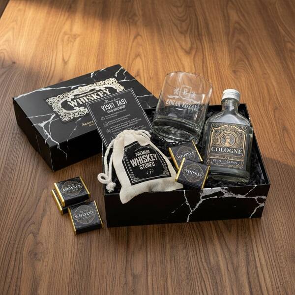 1 -) 18 X 24 X 10 cm mermer desenli siyah hediye kutulu konsept hediye kutusu içerisinde;** 1 Adet Kaliteli Viski Bardağı. İsme özel olup, viski bardağı ölçüleri 9 cm ve çapı 7 cm'dir. Kapasitesi 800 cc hacim ölçeğine sahiptir.** 4 Adet Viski Taşı** 6 Adet özel tasarım kare sütlü çikolata.** 1 Adet Okyanus Esintisi Fresh kolonya. 80 derece.2 -) Özel tasarım kutu içerisinde şık bir şekilde gönderilmektedir.3 -) Viski kadehleri üzerine lazer işleme tekniği ile kazıma yapılmakta olup asla silinmez özelliktedir.4 -) Tasarım Viski Bardağı ve Kolonya Whiskey Set hafta içi saat 14.00'a kadar verilecek siparişlerde aynı gün kargoya teslim edilmektedir.Bilgilendirme: Satışı yapılan ürün, yalnızca içki servisi için tasarlanmış bir aksesuar setidir. Bu ürün alkollü içki içermez ve alkol tüketimini teşvik etme amacı taşımaz. 18 yaşından küçüklere alkollü içki satışı yasaktır. Aşırı alkol tüketimi sağlığa zararlıdır. Lütfen sorumlu bir şekilde tüketiniz.Ürün Etiketleri