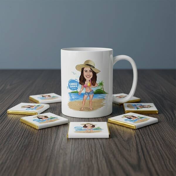 Tatildeki güzellikleri ve anıları ölümsüzleştiren kadın için özel bir hediye: tatildeki güzel kadın karikatürlü kupa bardak ve lezzetli çikolatalar, unutulmaz anıları her yudumda canlandıracak.