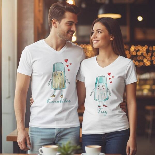Tuz ve biber bir yemeğin asli unsurlarındandır. Lezzetli bir yemeğin olmazsa olmazlarıdır. Aynı zamanda sofraların da vazgeçilmezidir. Eğer siz de hayatınızda sevgiliniz olmazsa kendinizi sanki sofra başında tuzsuz bibersiz kalacakmışsınız gibi, yani hayatınızın renksiz geçebileceği hissine kapılıyorsanız, O halde bu güzel insanın elini sonsuza kadar hiç bırakmayın! Birinde karabiber, diğerinde ise tuzluk figürlerinin yer aldığı bu esprili çift tişörtü ile sevgilinizle yakaladığınız harika aşk modunu kıyafetlerinizle de dile getirebilirsiniz.