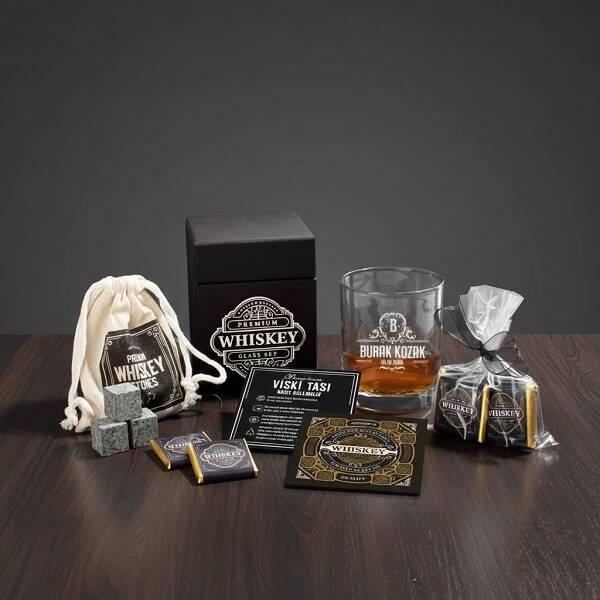 1 -) 9,5 X 12 cm mermer desenli siyah hediye kutulu konsept hediye kutusu içerisinde;** 1 Adet Kaliteli Viski Bardağı. İsme özel olup, viski bardağı ölçüleri 9 cm ve çapı 7 cm'dir. Kapasitesi 800 cc hacim ölçeğine sahiptir.** 4 Adet Viski Taşı** 2 Adet Tasarım Ahşap Bardak Altlığı** 6 Adet özel tasarım kare sütlü çikolata.2 -) Özel tasarım kutu içerisinde şık bir şekilde gönderilmektedir.3 -) Viski kadehleri üzerine lazer işleme tekniği ile kazıma yapılmakta olup asla silinmez özelliktedir.4 -) Viski Kadehi ve Erkeğe Özel Viski Taşı Hediye Kutusu hafta içi saat 14.00'a kadar verilecek siparişlerde aynı gün kargoya teslim edilmektedir.