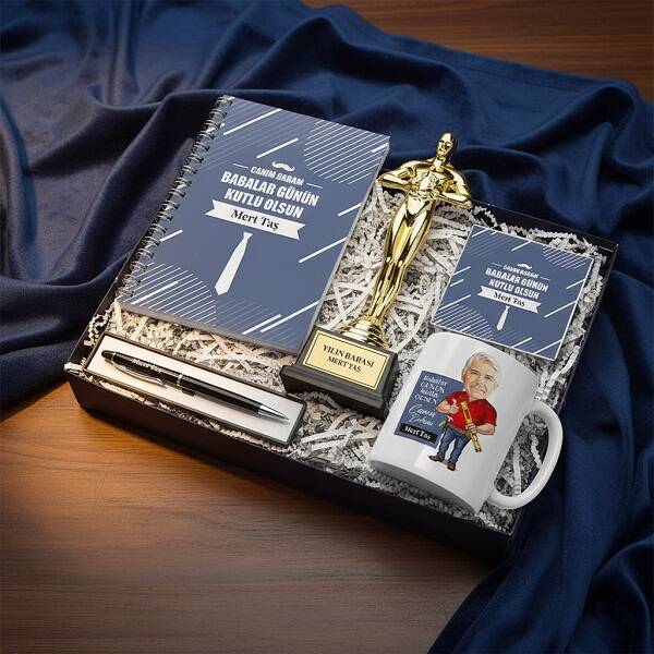 1 -) Hediye kutusu içerisinde 5 parça ürün yer almaktadır.** 1 Adet Babanızın karikatürüne ve Babalar Günü mesajınıza özel olarak hazırlanacak esprili kupa bardak** 1 Adet İstediğiniz Babalar Günü mesajınız ve Babanızın ismine özel olarak hazırlanacak Oscar Ödül heykelciği** 1 Adet Babalar Günün Kutlu Olsun mesajlı Babanızın ismine özel çizgisiz defter** 1 Adet Babalar Günün Kutlu Olsun mesajlı Babanızın ismine özel taş bardak altlığı** 1 Adet Babanızın ismine özel tükenmez kalem.2 -) Kutu Ölçüleri: 35 X 25 X 11 cm.'dir. Harika bir sunuma sahip olan bu özel hediye kutusuyla Babanıza Esprili bir Babalar Günü sürprizi yapabilirsiniz.3 -) Kutu içerisinde Z kesim diye adlandırılan kırpıntı süs kağıtları yer almaktadır. Bu şekilde hediye kutusu içerisindeki ürünler daha zarif bir görünüme kavuşur.4 -) Yetenekli Baba Konsept Hediye Kutusu, hafta içi saat 14.00'a kadar vereceğiniz siparişlerinizde aynı gün kargoya teslim edilmektedir.Ürün Etiketleri