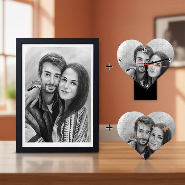 * Son olarak Çerçeveli resminiz+Kalp Masa Saati+ 99 Parça Kalp Puzzle tamamlanıp siparişiniz kargolamaya hazır (Bu üründe Kargo Bedava.) hale getiriliyor.Yıldönümü Hatırası Karakalem Resim Hediye Seti Hakkında Bilinmesi Gerekenler